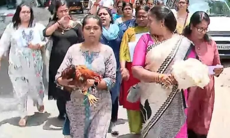 രാഹുല് മാങ്കൂട്ടത്തിലിന്റെ ഓഫീസിലേയ്ക്ക് മഹിളാ മോര്ച്ച പ്രവര്ത്തകര് കോഴികളുമായി നടത്തിയ മാര്ച്ചിനിടെ കോഴി ചത്തു ; മഹിളാ മോര്ച്ച പ്രവര്ത്തകര്ക്കെതിരെ പരാതി