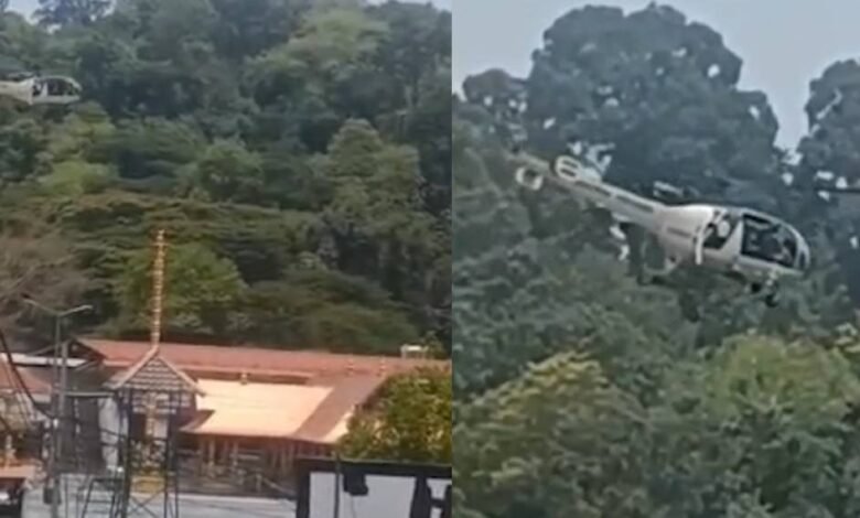 ഇന്നലെ രാവിലെ 11 മണിയോടെയാണ് തീരസുരക്ഷാ സേനയുടെ സി ജി 821 എന്ന ഹെലികോപ്റ്റര് സന്നിധാനത്ത് പറന്നത്. കൊടിമരത്തിന് അഞ്ച് മീറ്റര് ഉയരത്തില് വരെ ഹെലികോപ്റ്റര് പറന്നിട്ടുണ്ട്. ഹെലികോപ്റ്ററില് നാലുപേരാണ് ഉണ്ടായിരുന്നത്. ഒരാള് ക്ഷേത്രത്തിന്റെ ദൃശ്യങ്ങള് പകര്ത്തുകയും ചെയ്തു. 30 സെക്കന്ഡ് സമയം സന്നിധാനത്തിന് സമീപം ഹെലികോപ്റ്റര് പറന്നു.