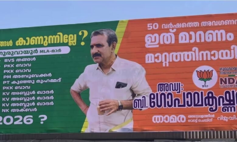 ജാതി പറഞ്ഞ് വോട്ട് ചോദിച്ച വിവാദത്തിൽ കുടുങ്ങിയത് പിന്നാലെയാണ് ചാവക്കാട് ബി ഗോപാലകൃഷ്ണന്റെ വിവാദ ഫ്ലക്സ് . 1977 മുതൽ 2021 വരെയുള്ള ഗുരുവായൂരിലെ എംഎൽഎമാരുടെ പേരുകൾ നിരത്തിയാണ് ഗോപാലകൃഷ്ണൻ മാറ്റം ആവശ്യപ്പെടുന്നത്. ഫ്ലക്സ് ഉയർന്നതിന് പിന്നാലെ സമൂഹമാധ്യമങ്ങളിൽ അതിരൂക്ഷ വിമർശനം ഉയർന്നു. കേസ് വന്നാൽ പേടിക്കില്ലെന്നും പെരുമാറ്റ ചട്ട ലംഘനം നടത്തിയിട്ടില്ല എന്നുമാണ് ഗോപാലകൃഷ്ണന്റെ വാദം. വിഭജനത്തിന്റെ രാഷ്ട്രീയമാണ് ഗോപാലകൃഷ്ണന്റേത് എന്ന് എൽഡിഎഫ് സ്ഥാനാർത്ഥി എൻ കെ അക്ബർ കുറ്റപ്പെടുത്തി. ഗോപാലകൃഷ്ണനെതിരെ പരാതി നൽകുമെന്ന് യുഡിഎഫ് സ്ഥാനാർത്ഥി സി എച്ച് റഷീദും അറിയിച്ചു.