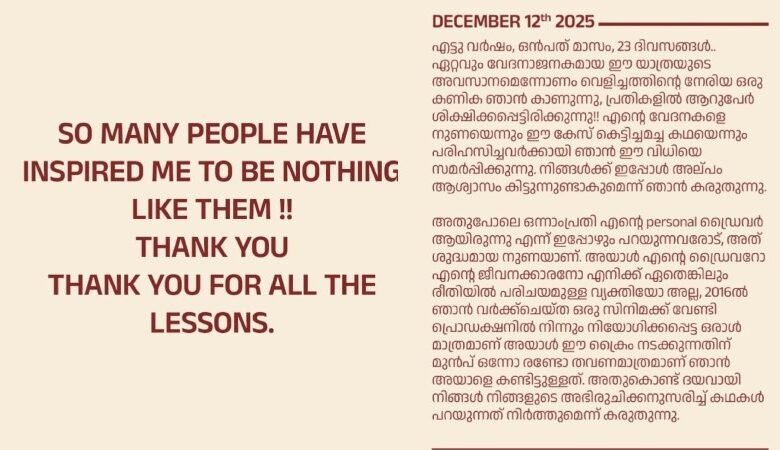 അതുപോലെ ഒന്നാംപ്രതി എന്റെ personal ഡ്രൈവർ ആയിരുന്നു എന്ന് ഇപ്പോഴും പറയുന്നവരോട്, അത് ശുദ്ധമായ നുണയാണ്. അയാൾ എന്റെ ഡ്രൈവറോ എന്റെ ജീവനക്കാരനോ എനിക്ക് ഏതെങ്കിലും രീതിയിൽ പരിചയമുള്ള വ്യക്തിയോ അല്ല, 2016ൽ ഞാൻ വർക്ക്‌ചെയ്ത ഒരു സിനിമക്ക് വേണ്ടി പ്രൊഡക്ഷനിൽ നിന്നും നിയോഗിക്കപ്പെട്ട ഒരാൾ മാത്രമാണ് അയാൾ ഈ ക്രൈം നടക്കുന്നതിന് മുൻപ് ഒന്നോ രണ്ടോ തവണമാത്രമാണ് ഞാൻ അയാളെ കണ്ടിട്ടുള്ളത്. അതുകൊണ്ട് ദയവായി നിങ്ങൾ നിങ്ങളുടെ അഭിരുചിക്കനുസരിച്ച് കഥകൾ പറയുന്നത് നിർത്തുമെന്ന് കരുതുന്നു.