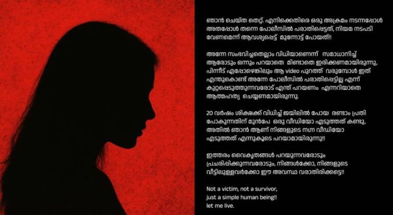 20 വർഷം ശിക്ഷക്ക് വിധിച്ച് ജയിലിൽ പോയ രണ്ടാം പ്രതി പോകുന്നതിന് മുൻപേ ഒരു വീഡിയോ എടുത്തത് കണ്ടു. അതിൽ ഞാൻ ആണ് നിങ്ങളുടെ നഗ്ന വീഡിയോ എടുത്തത് എന്നുകൂടെ പറയാമായിരുന്നു!! ഇത്തരം വൈകൃതങ്ങൾ പറയുന്നവരോടും പ്രചരിപ്പിക്കുന്നവരോടും, നിങ്ങൾക്കോ, നിങ്ങളുടെ വീട്ടിലുള്ളവർക്കോ ഈ അവസ്ഥ വരാതിരിക്കട്ടെ!!