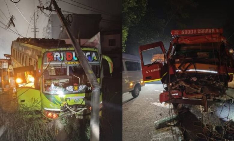ഇന്ന് പുലര്ച്ചെ രണ്ട് മണിയോടെയാണ് സംഭവം. എം സി റോഡിൽ മൂവാറ്റുപുഴയ്ക്ക് സമീപം തൃക്കളത്തൂരിലാണ് അപകടമുണ്ടായത്. ഓടിക്കൊണ്ടിരുന്ന ബസ് പെട്ടെന്ന് നിർത്തിയതിനു പിന്നാലെ ലോറി ബസിനു പുറകിൽ വന്നിടിക്കുകയായിരുന്നു. ഇടിയുടെ ആഘാതത്തിൽ നിയന്ത്രണം വിട്ട ബസ് റോഡിനു വശത്ത് നിർത്തിയിട്ടിരുന്ന കാറിലും വൈദ്യുത പോസ്റ്റിലും ഇടിച്ചാണ് നിന്നത്.