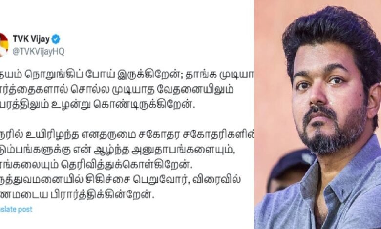 ‘എന്റെ ഹൃദയം തകര്ന്നിരിക്കുന്നു. വിവരിക്കാന് കഴിയാത്ത വേദനയിലും ദുഃഖത്തിലും ഞാന് പുളയുകയാണ്. കരൂരില് ജീവന് നഷ്ടപ്പെട്ട പ്രിയപ്പെട്ട സഹോദരി സഹോദരന്മാരുടെ കുടുംബങ്ങള്ക്ക് അനുശോചനം അറിയിക്കുന്നു. ചികിത്സയില് കഴിയുന്നവര് വേഗത്തില് സുഖം പ്രാപിക്കട്ടെ എന്ന് ഞാന് പ്രാര്ത്ഥിക്കുന്നു.’ വിജയ് തന്റെ എക്സ് പോസ്റ്റില് കുറിച്ചു.