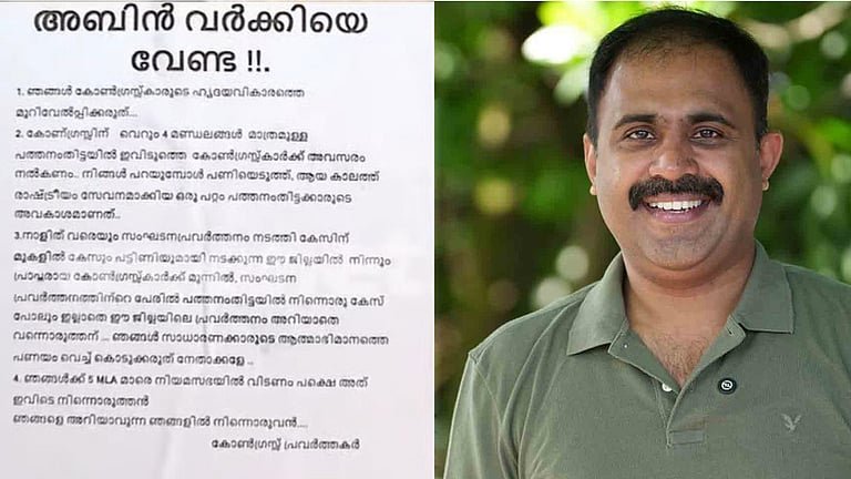 ആറന്മുളയില് അബിന് വര്ക്കി സ്ഥാനാര്ഥിയാകുമെന്ന് ഏറെക്കുറെ ഉറപ്പായിരുന്നു. ഈ നീക്കങ്ങള്ക്ക് തിരിച്ചടിയാണ് മണ്ഡലത്തില് അബിനെതിരെയുള്ള പോസ്റ്ററുകള്. ആറന്മുള, ഓമല്ലൂര്, ചെന്നീര്ക്കര, ഇലന്തൂര്, കോഴഞ്ചേരി എന്നിവിടങ്ങളിലും പോസ്റ്ററുകള് പ്രത്യക്ഷപ്പെട്ടു.