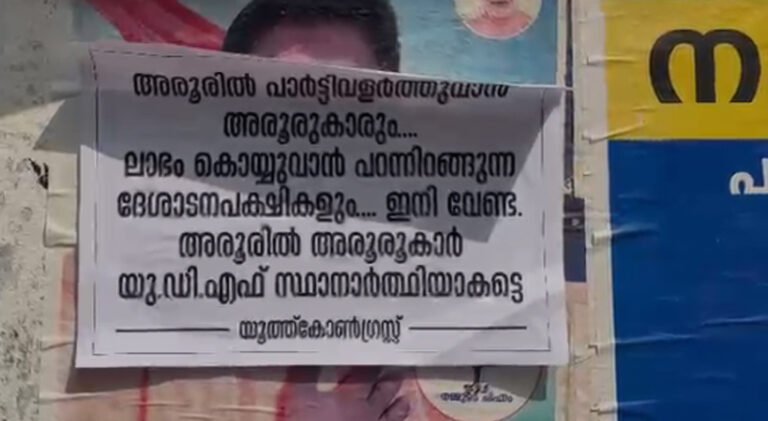 യൂത്ത് കോൺഗ്രസിന്റെ പേരിലാണ് പോസ്റ്റർ പ്രത്യക്ഷപ്പെട്ടിരിക്കുന്നത്. മണ്ഡലത്തിൽ വിവിധയിടങ്ങളിലാണ് പോസ്റ്റർ ഉയർന്നത്. “പാർട്ടി വളർത്താൻ അരൂരുകാരും… ലാഭം കൊയ്യാൻ പറന്നിറങ്ങുന്നവരും വേണ്ട” എന്നാണ് പോസ്റ്ററിൽ എഴുതിയിരിക്കുന്നത്.