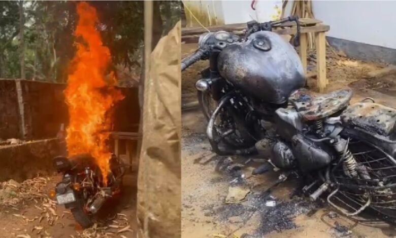 സ്റ്റാർട്ട് ചെയ്യുന്നതിനിടെ എൻഫീൽഡ് ബൈക്കിന് തീ പിടിച്ചു ; യാത്രക്കാരന് അദ്ഭുതകരമായി രക്ഷപ്പെട്ടു, ബൈക്ക് പൂർണ്ണമായും കത്തി