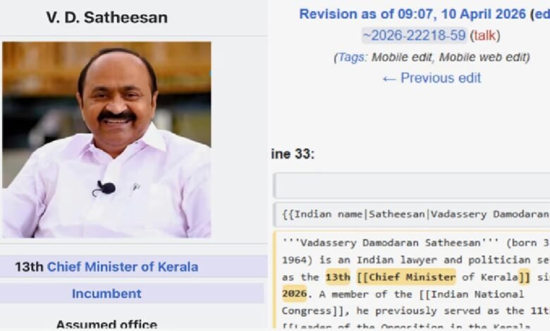 വി ഡി സതീശൻ കേരളത്തിന്റെ പുതിയ മുഖ്യമന്ത്രി ; വിക്കിപീഡിയ പേജ് ആരോ എഡിറ്റ് ചെയ്തു