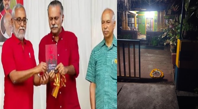 കണ്ണൂർ പയ്യന്നൂരിൽ സിപിഐഎം പുറത്താക്കിയ വി കുഞ്ഞികൃഷ്ണന്റെ പുസ്തകം ഏറ്റുവാങ്ങിയ എഴുത്തുകാരൻ വി എസ് അനിൽകുമാറിന്റെ വീടിന് മുന്നിൽ റീത്ത്. കണ്ണപുരത്തെ വീടിന് മുന്നിലാണ് റീത്ത് വെച്ചത്. അന്തരിച്ച പ്രൊഫ. എം എൻ വിജയൻ്റെ മകനാണ് വി എസ് അനിൽകുമാർ. പുസ്തകം ഏറ്റുവാങ്ങിയതിന് പിന്നാലെ അനില്കുമാറിനെതിരെ സാമൂഹ്യമാധ്യമങ്ങളിൽ വലിയ രീതിയിൽ പ്രകോപനപരമായ എഴുത്തുകളടക്കം ഉയർന്നിരുന്നു.