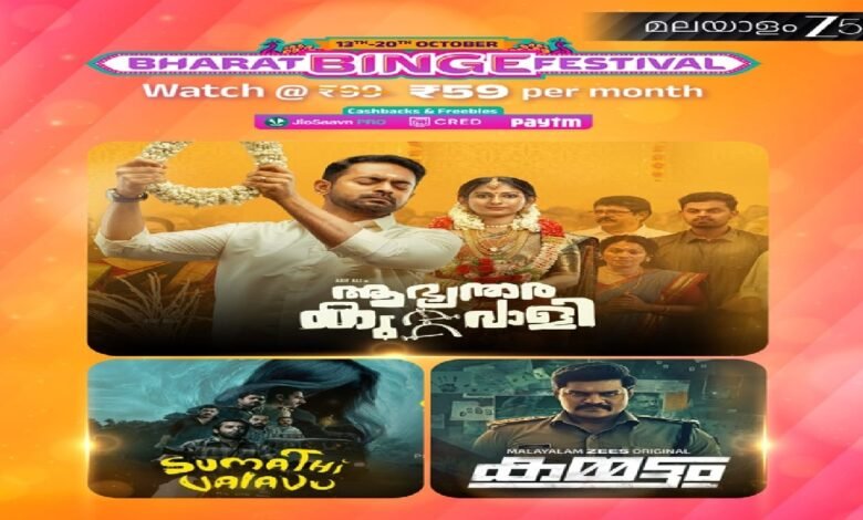 ഭാരത് ബിഞ്ച് ഫെസ്റ്റിവലിന്റെ ഭാഗമായി ഏഴ് ഭാഷകളിലായി പുതിയ പ്രീമിയറുകളും പ്രേക്ഷകർ ഏറെ ഇഷ്ടപ്പെടുന്ന ഹിറ്റുകളും ഉൾപ്പെടുത്തി ഒരുങ്ങുന്ന പ്രത്യേകമായ ആഘോഷമാണ് ZEE5 ഇത്തവണ ഒരുക്കിയിരിക്കുന്നത്.ഹിന്ദിയിൽ:Bhagwat Chapter One – Raakshas, Saali Mohabbat, Honeymoon Se Hathya,തമിഴിൽ:Veduvan, Housemates, Maaman,തെലുങ്ക്ൽ: Kishkindapuri¸D/O Prasadrao Kanabadutaledu, Jayummu Nischayamu Ra,മറാത്തിയിൽ: Sthal, Ata Thambaych Naay, Jarann,ബംഗാളിയിൽ: Mrs Dasgupta, Mrigaya: The Hunt, Abar Proloy,കന്നഡയിൽ: Elumale, Ayyana Mane,Marigallu,എന്നി ചിത്രങ്ങൾ ZEE5 ഇൽ കാണാം.